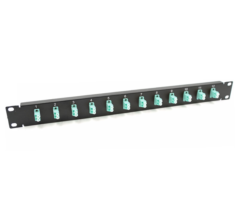 This 12 Port, Rack Mount, Adapter Plate is the size of a 1RU 19" panel, and is loaded with 12 LC Aqua Duplex Adapters. This face plate meets all applicable standards and can be fitted with any custom array of adapters. Adapters are included.